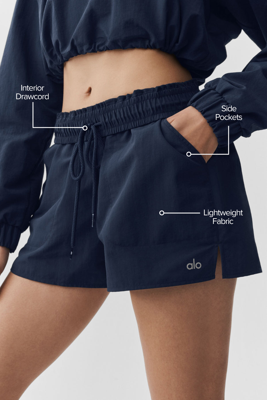 Bend, stretch, hike and explore new heights in the Alumni Short. Made in our lightweight, sport-ready woven fabric, it features a flattering high-waist design, an easy internal drawcord, and side slit pockets to store keys, lip balm and other small essentials. Go head-to-toe and hit the pavement with the matching cropped pullover.