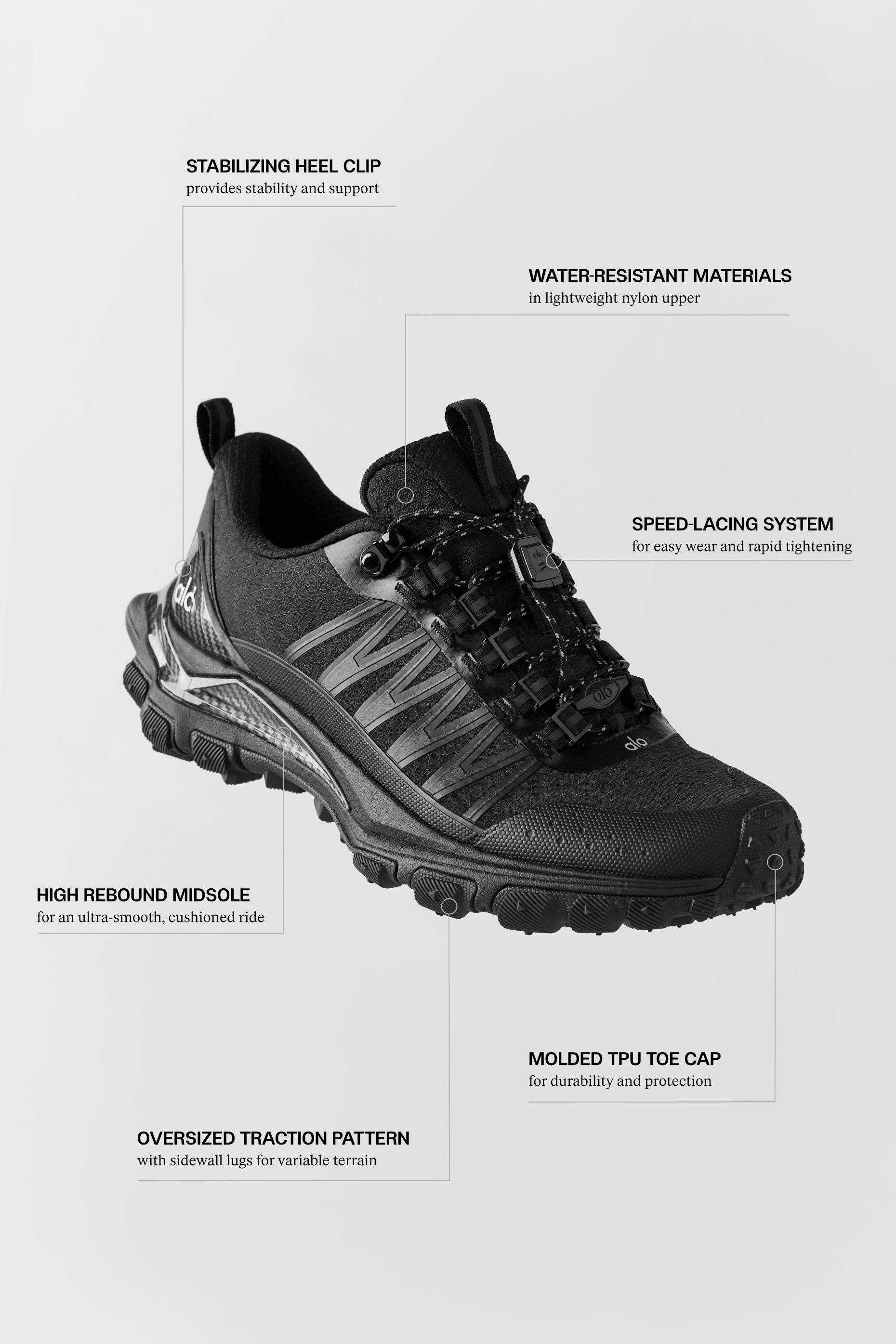 The ALO Trail was built for connection, ease, and moving meditation. From trail to street and everywhere in between, this performance shoe was designed with off-the-grid movement in mind. It has a lightweight nylon upper constructed with water-resistant materials and features like a stabilizing heel clip, molded TPU toe cap, and high-rebound midsole compound for stability, support, and protection. You’ll have grip on variable terrain with the oversized traction pattern with sidewall lugs and easy wear and rapid tightening with the speed lacing system, with a cord lock and puller. Get ready to build momentum and forge a new path in the ALO Trail.